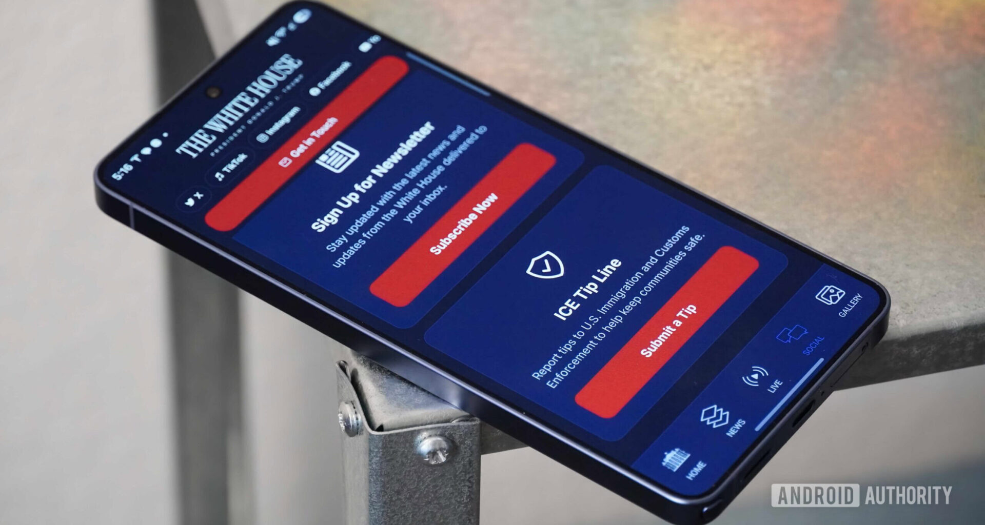 Da mesma forma, a página “Social” agrega conteúdo de X (anteriormente Twitter), TikTok, Instagram, Facebook, YouTube, LinkedIn, Truth Social e feeds RSS. Esta é a parte mais problemática do aplicativo, pois tentar rolar no feed “Social” revela gagueira constante e baixa capacidade de resposta. Tocar no botão “Entre em contato” nesta página revela uma “Linha de dicas do ICE” que o aplicativo explica que existe para “relatar dicas ao Departamento de Imigração e Alfândega dos EUA para ajudar a manter as comunidades seguras”.