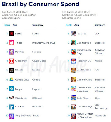| Apps em que usuários brasileiros mais gastaram dinheiro em 2018 (fonte: App Annie) |
