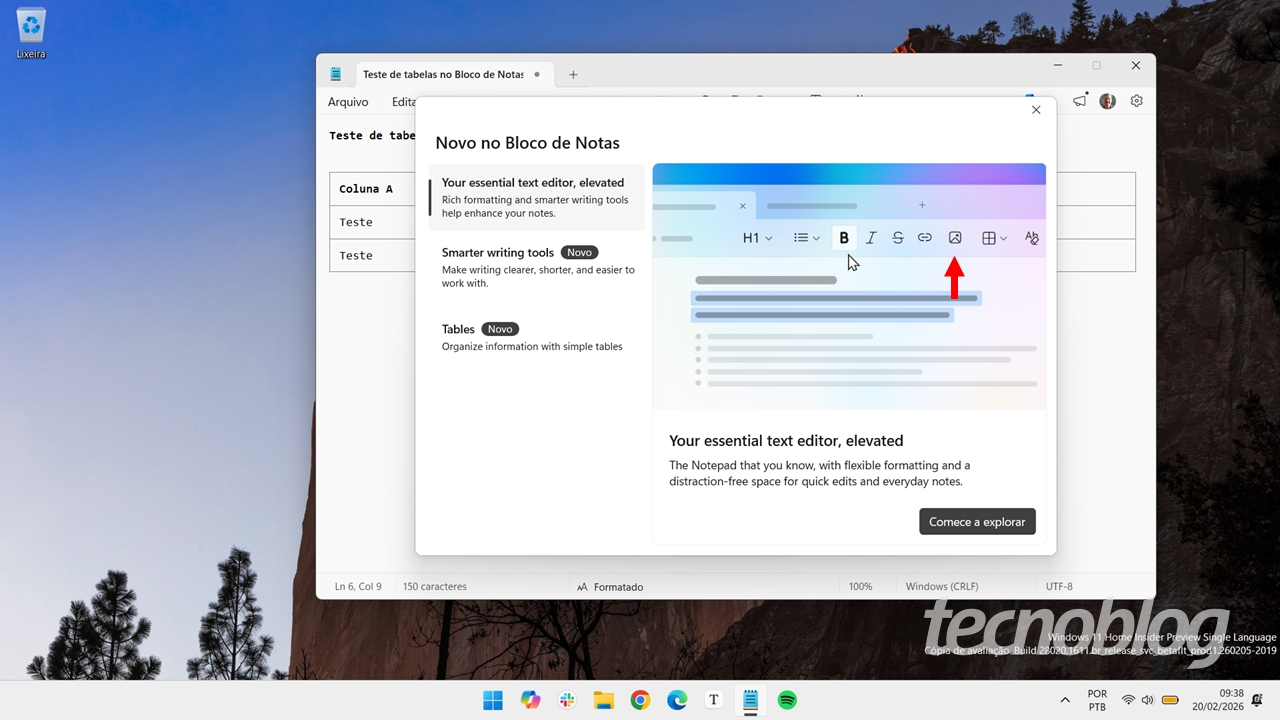 Esse botão ainda não é visível no editor de texto, mas, no anúncio, aparece ao lado de outro recurso recente: o botão para inserção de tabelas no Bloco de Notas.
