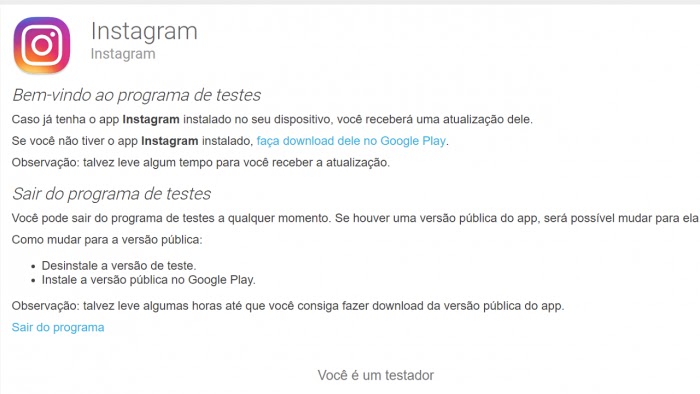 - Acesse a página do programa de testes do Instagram no Google Play;
