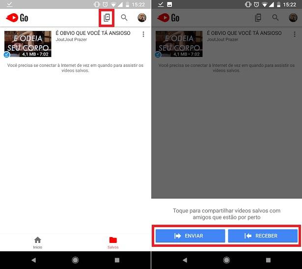 Os usuários também podem enviar vídeo salvos para outras pessoas, sem precisar de internet. Nesse caso, ative o Bluetooth, toque no símbolo de envio no topo da tela toque em “Enviar” ou “Receber”, caso você vá receber um vídeo e escolha o vídeo e o contato;
