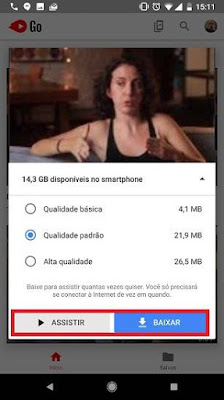 2. Você terá a opção de assistir o vídeo ou baixar o conteúdo – em ambos os casos você pode escolher a qualidade de exibição do vídeo. Além disso, o aplicativo também mostra quanto espaço de armazenamento tem disponível no seu smartphone;