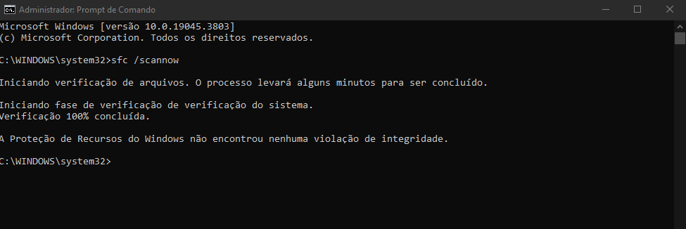 1. “Proteção de recursos do Windows não encontrou nenhuma violação de integridade” – Indica que não há arquivos corrompidos.