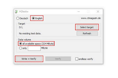 2. Abra o H2testw, marque a opção “English” e em “Select target”, selecione a letra referente a unidade do cartão. Deixe a opção “all available space” marcada em “Data volume” e clique em “Write + Verify”;