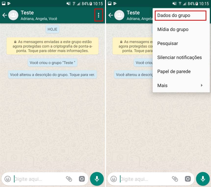 2. Na tela de conversa do grupo, dê um toque no ícone representado por “três pontos” e acesse “Dados do grupo”;