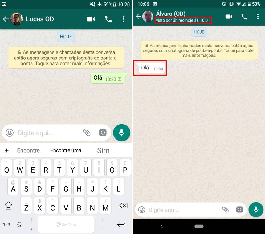 2. Abra o WhatsApp e leia a mensagem. Veja que a imagem abaixo a direita não soube que a pessoa esteve online;
