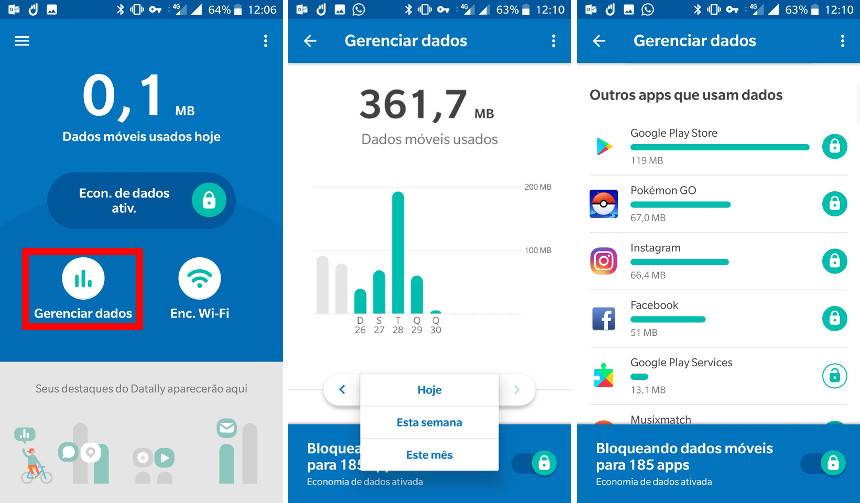 Conferir consumo de dados: Para ver o consumo de dados do seu smartphone, toque sobre a opção “Gerenciar dados”. O aplicativo mostrará gráficos com o consumo de dados, sendo possível escolher entre a visualização diária, semanal ou mensal. Além disso, é possível conferir abaixo quais apps mais gastam sua internet 3G;