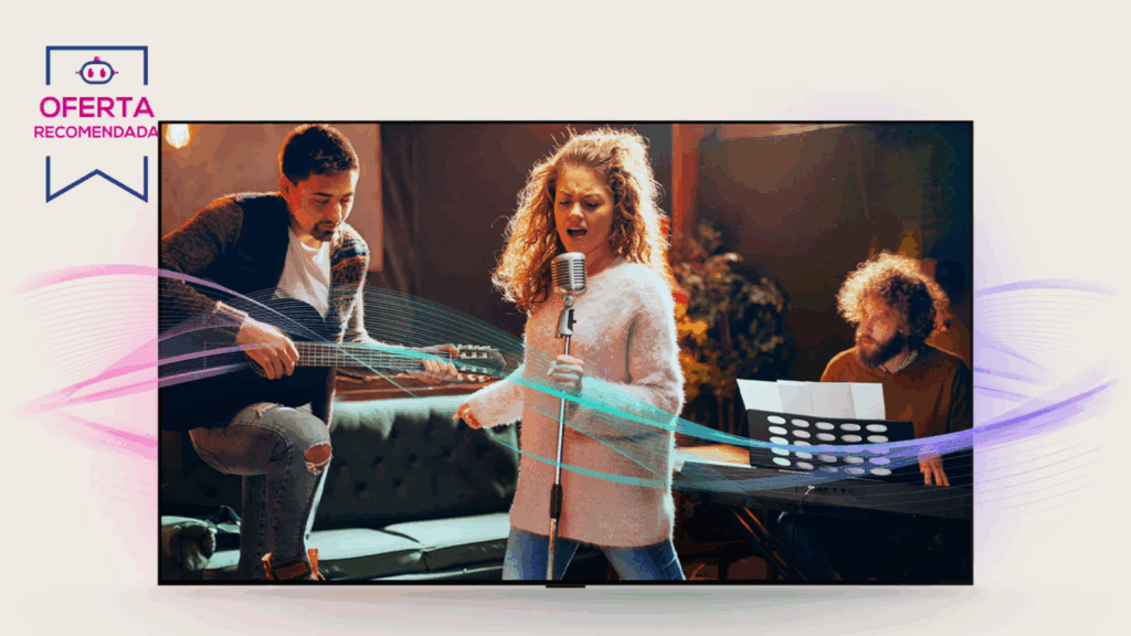A Smart TV possui a função AI Sound Pro, no qual identifica o áudio e ajusta automaticamente com base no ambiente. Outro recurso que conta com inteligência artificial, o AI Clear Sound nivela os volumes para permitir que os diálogos fiquem mais claros e limpos. A saída de áudio conta com potência de 20 W.