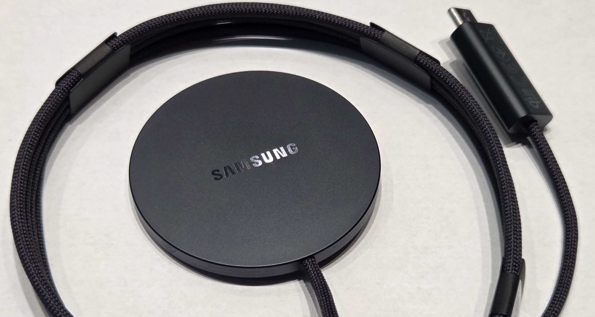 O carregador possui uma porta USB-C em uma extremidade e o cabo parece ser trançado, o que é bom para durabilidade. O relatório afirma que a Samsung recomenda emparelhar este disco de carregamento sem fio de 25 W com um carregador USB PD de 45 W.