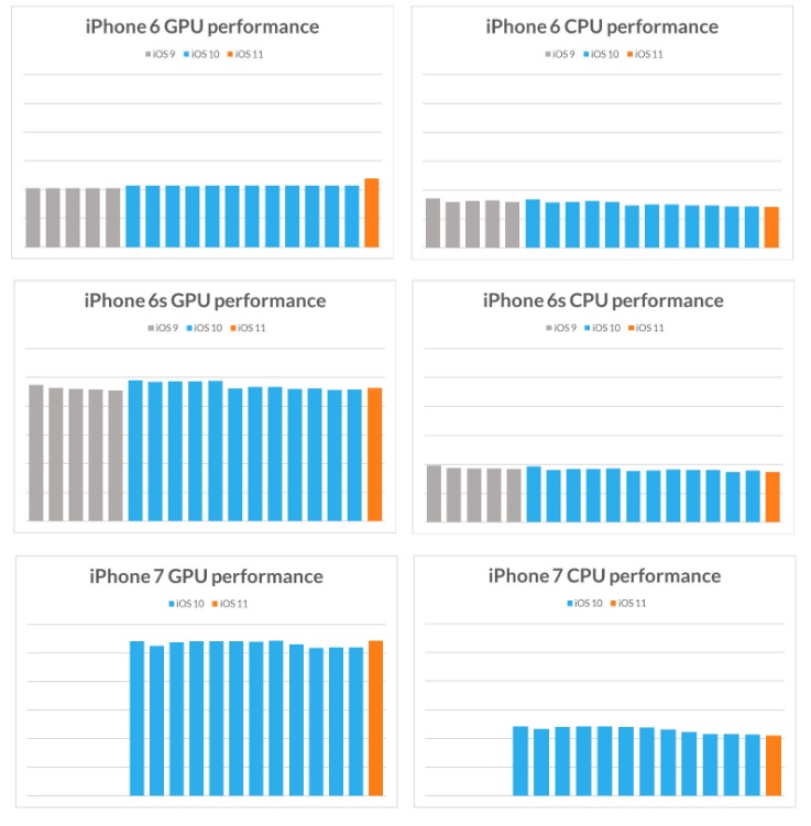 De acordo com a Futuremark, que desenvolve ferramentas de benchmark para análise de desempenho, essa crença não tem fundamentos técnicos. A afirmação se baseia em uma amostragem de 100 mil testes em sua plataforma executados entre abril de 2016 e setembro de 2017, com iPhones variando entre os modelos 5s e o iPhone 7, rodando versões do iOS 9, 10 e 11.