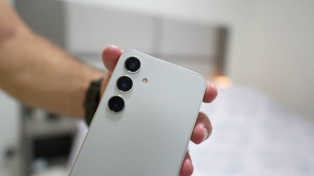 De modo geral, o Galaxy S24 padrão vem com câmera frontal de 12 MP, abertura f/2.2 e gravação em 4K. Na traseira, há três sensores: principal de 50 MP com estabilização óptica, teleobjetiva de 10 MP com zoom óptico de 3x e ultrawide de 12 MP com campo de visão de 120°.
