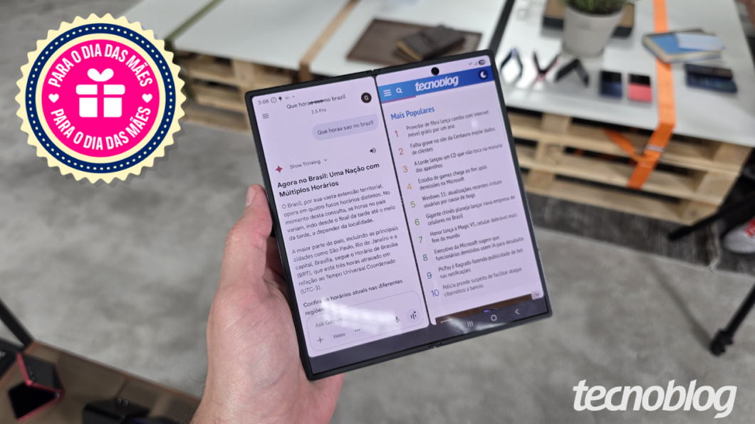 Se você está entre comprar um celular ou um tablet como presente para esse Dia das Mães, o Galaxy Z Fold 7 é um dispositivo que pode suprir as duas funcionalidades. Com a tela interna aberta, ele mede 8 polegadas, oferecendo conforto para leitura e consumo de mídia; já dobrado, mede 6,5″. Ambos os displays são AMOLED de 120 Hz.