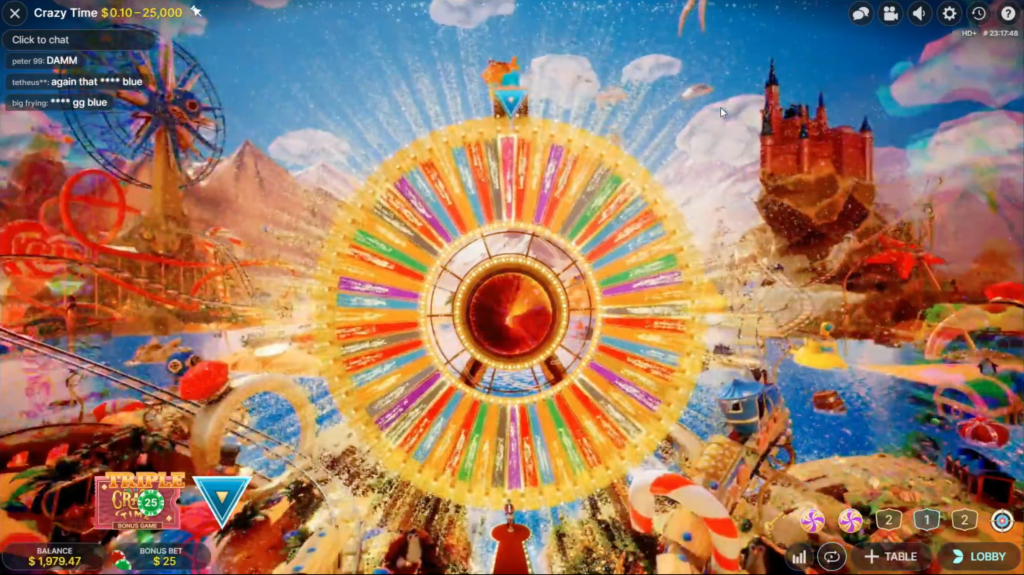 O Crazy Time tem um bônus mais gratificante chamado “triplo” que multiplica todas as recompensas por três vezes ao invés de somente duas. Ele funciona da mesma forma que o dobro, mas desaparece da roda após ser acionado enquanto o dobro pode ser ganho várias vezes.