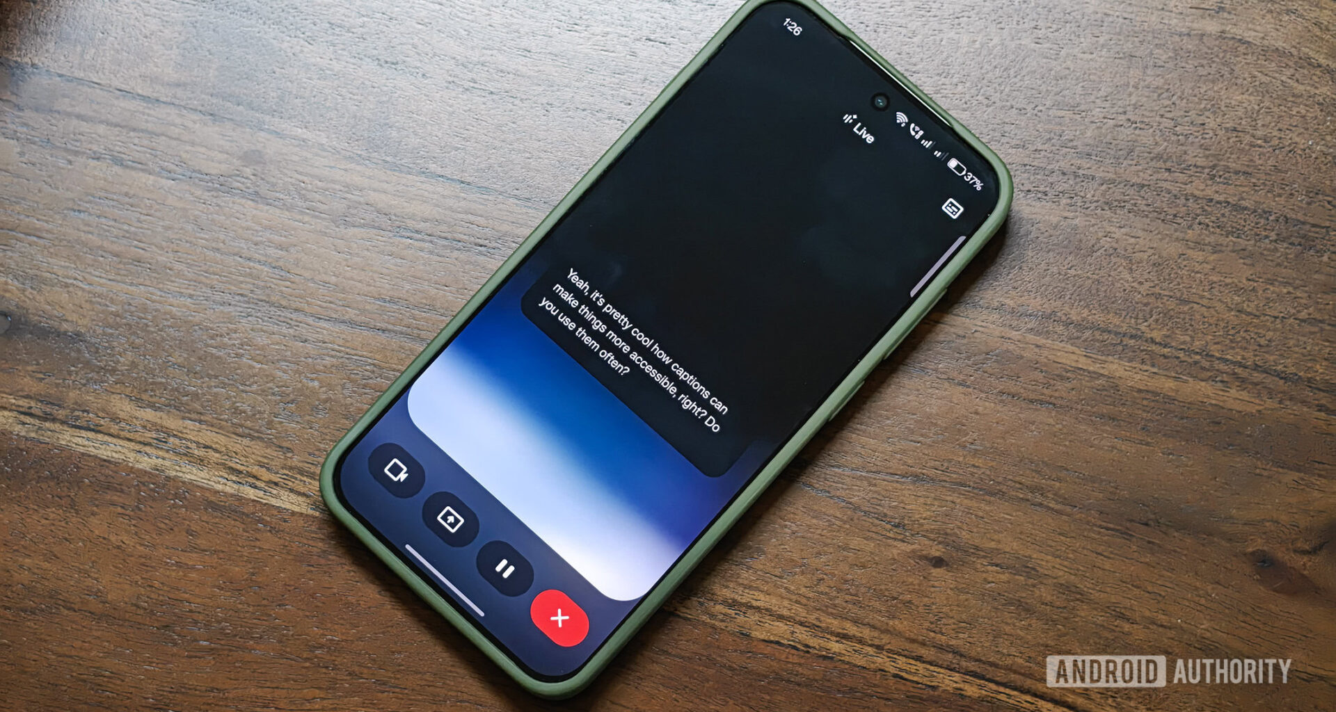 Legendas ao vivo do Google Gemini no aplicativo Android rodando em um OnePlus 13s mantido sobre a superfície de uma mesa de madeira.