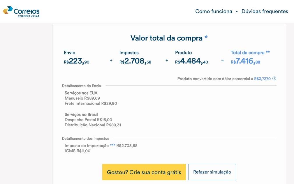 Como podemos ver, a plataforma Compra Fora tem seus méritos e compete em igualdade com as empresas privadas locais. Repetindo: o valor final da compra só será confirmado a partir do momento em que a mercadoria entrar no Brasil, pois os funcionários da Receita Federal podem não concordar com o valor prévio declarado pela mercadoria.