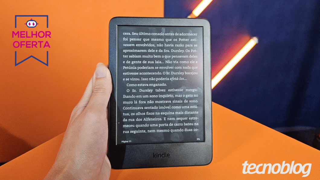 O Kindle possui apenas 158 gramas e tem 16 GB de armazenamento, o que permite armazenar centenas de títulos. Ele está disponível na Kindle Week da Amazon por R$ 521 no Pix.