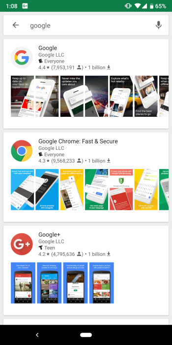 A Google testa uma nova interface da tela de resultados de busca para a Play Store com profundas diferenças em relação ao que existe atualmente. O novo estilo exibe os resultados em cards e, além disso, mostra em cada resultado as capturas de tela disponibilizadas pelo desenvolvedor que antes só poderiam ser visualizadas acessando cada item individualmente.