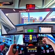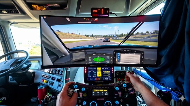 O caminhoneiro conseguiu realizar essa façanha ao substituir o banco do passageiro por um setup completo de simulação. A estrutura, inclusive, lembra um simulador profissional de corrida e voo.