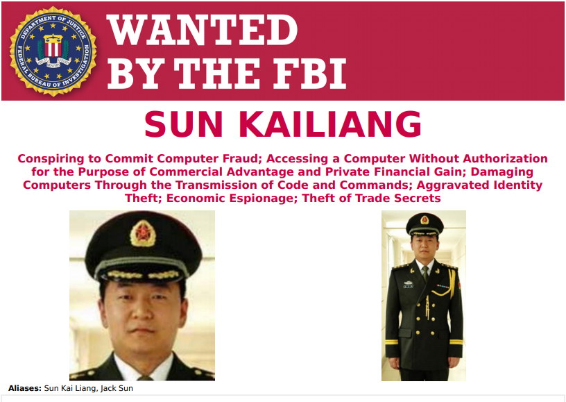 Um ex-militar chinês também é procurado pelo FBI. Kailiang seria líder de um grupo de hackers que atacou empresas privadas e órgãos do governo dos EUA entre 2006 e 2014. O ex-militar e sua equipe foram os primeiros estrangeiros alvos de acusações criminais na Justiça norte-americana.
