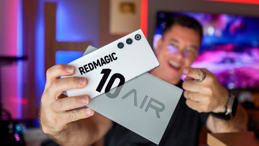 O RedMagic 10 Air aposta em um design mais fino e leve, com apenas 7,85 mm e 205 g. A traseira adota visual discreto, enquanto a frente traz tela sem interrupções e câmera sob o display. Há gatilhos laterais para jogos e acabamento em vidro e alumínio, mas apenas certificação IP54.