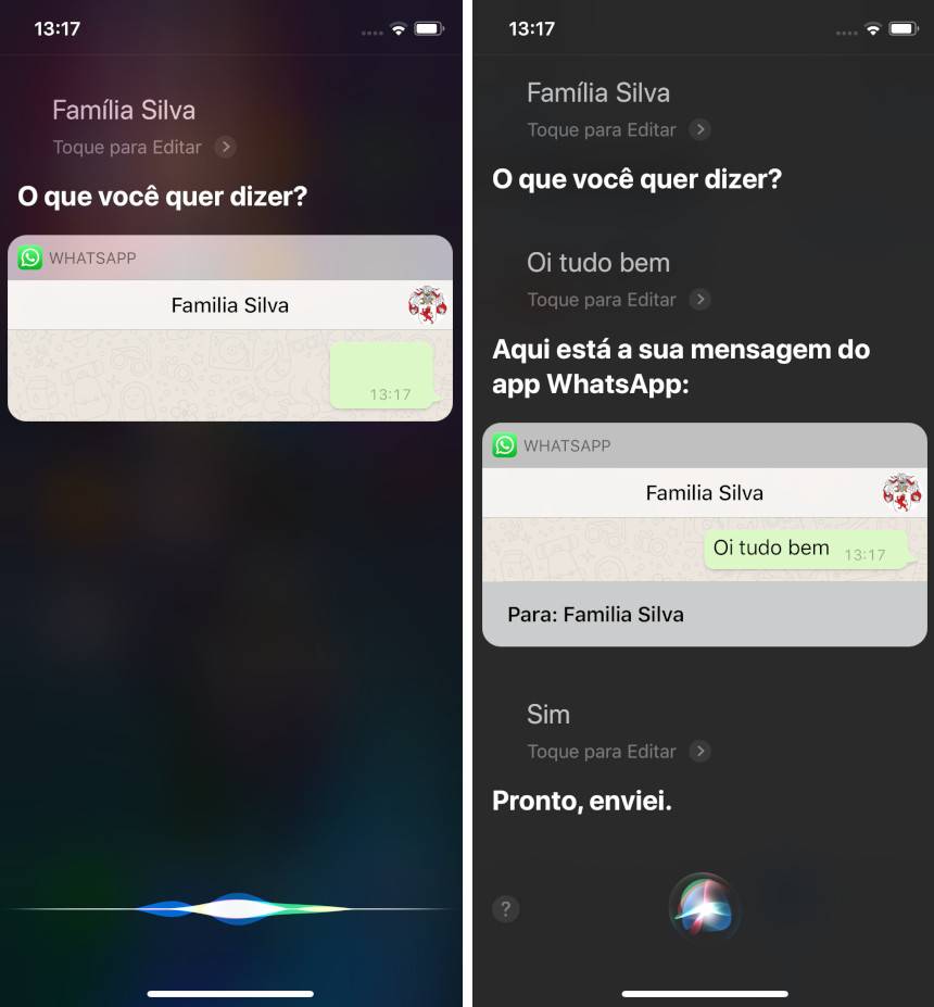 Outro recurso presente na atualização do WhatsApp é a possibilidade de enviar mensagens para grupos a partir da Siri. Basta acessar a assistente de voz e pedir para que ela envie uma mensagem no aplicativo. Quando for questionado para quem, é só dizer o nome do grupo e ditar o texto que será enviado.